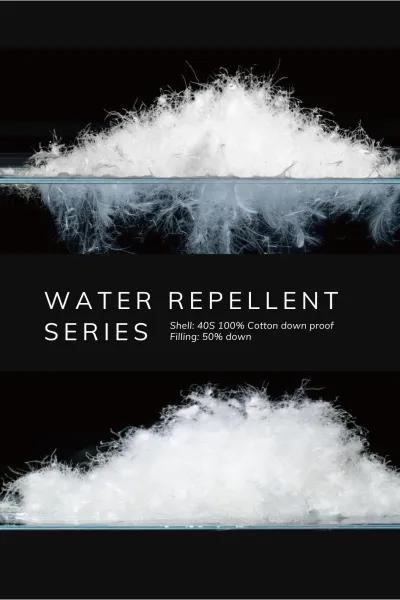 Through the special treatment of natural down to form a hydrophobic film, the water repellency reaches IDFB Standard Level 5. This effectively keeps down products dry, preventing loss of bulkiness, microbial growth, unpleasant odors, and other humidity-related issues. It also maximizes the thermal insulation performance of down and extends the service life of down products.
